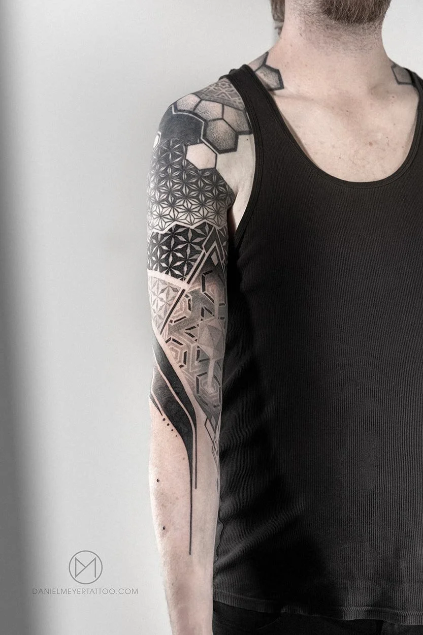 In 2024, nearly a decade later, David decided to add even more work to the project and expand the geometric design to both of his arms. We stayed true to the original concept, continuing the interplay of positive and negative space with a balance of blackwork and precise geometric elements, perfectly integrating the new work with the existing composition.