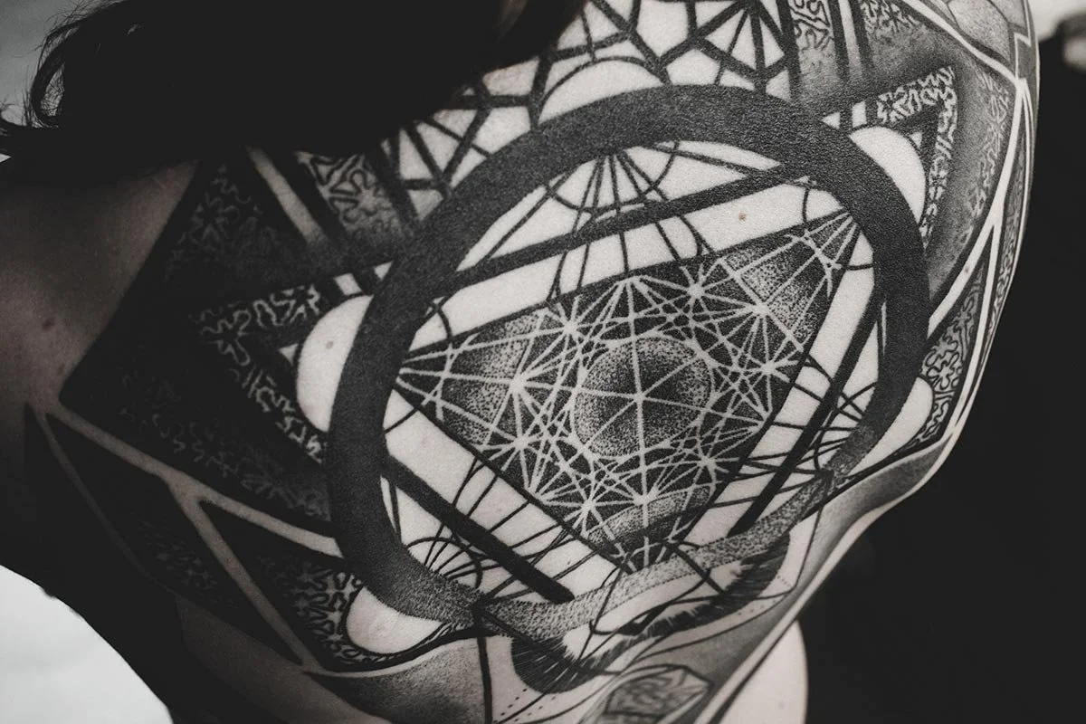 In 2016, he returned to expand the tattoo even further. For this next stage, we added large, V-shaped blackwork elements and a sequence of Platonic solids running down his spine to accentuate the flow of his anatomy. We extended the theme across both shoulders, maintaining consistency with the original design language. To break the strict symmetry and build visual interest and variety, we incorporated negative space into one of his shoulders—mirroring the hexagonal patterns from the rest of the piece, but creating contrast with the solid black elements of the other shoulder.
